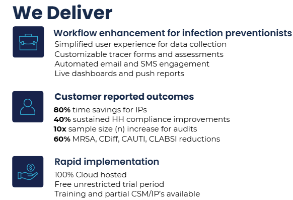We simplify auditing and reporting of infection prevention observations through a combination of human and automated data collection techniques.